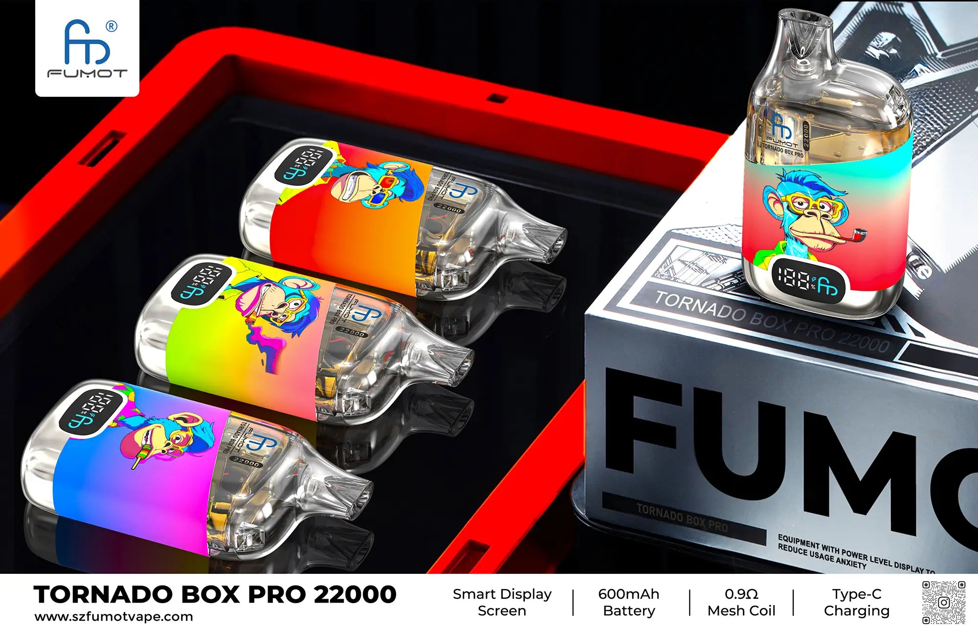 Fumot Tornado Box Pro 22000 is a disposable vape with a transparent oil tank design. The Digital Pro Box is an upgraded version of the Fumot Tornado Box 10000, featuring Mesh Coil Tech for even heating and a 600mAh rechargeable battery. The Digital Pro Box is available in 20 flavors and 4 salt levels, providing a customizable vaping experience. (Attention: The original name of this product was Digital Pro Box, and now it is renamed Tornado Box Pro.)